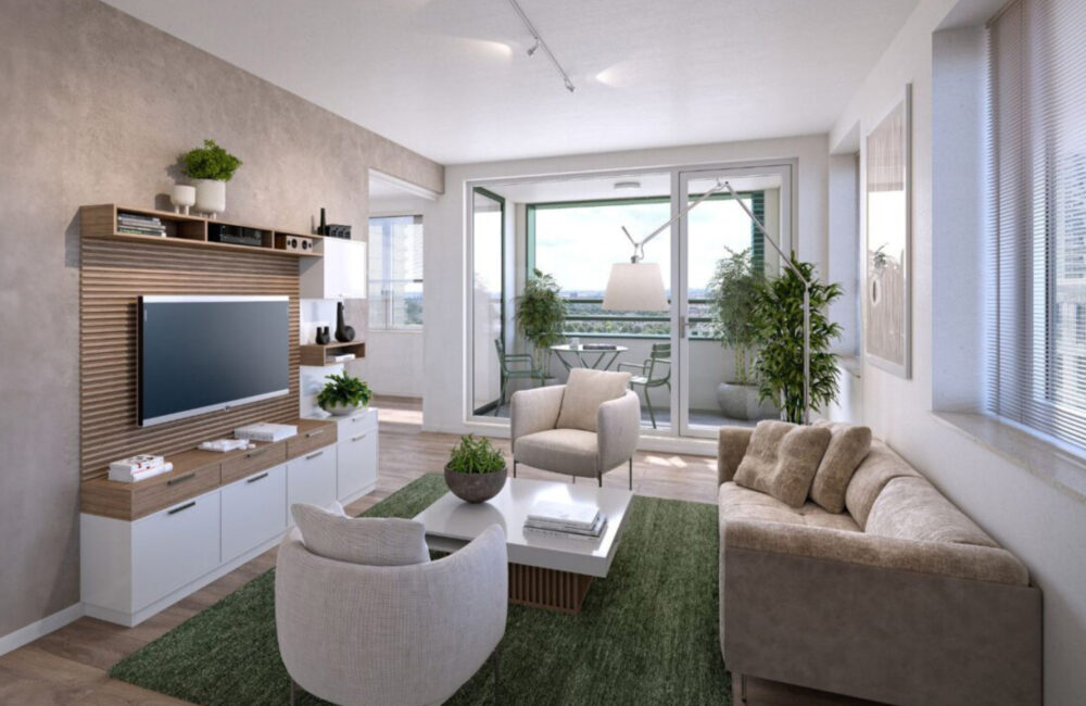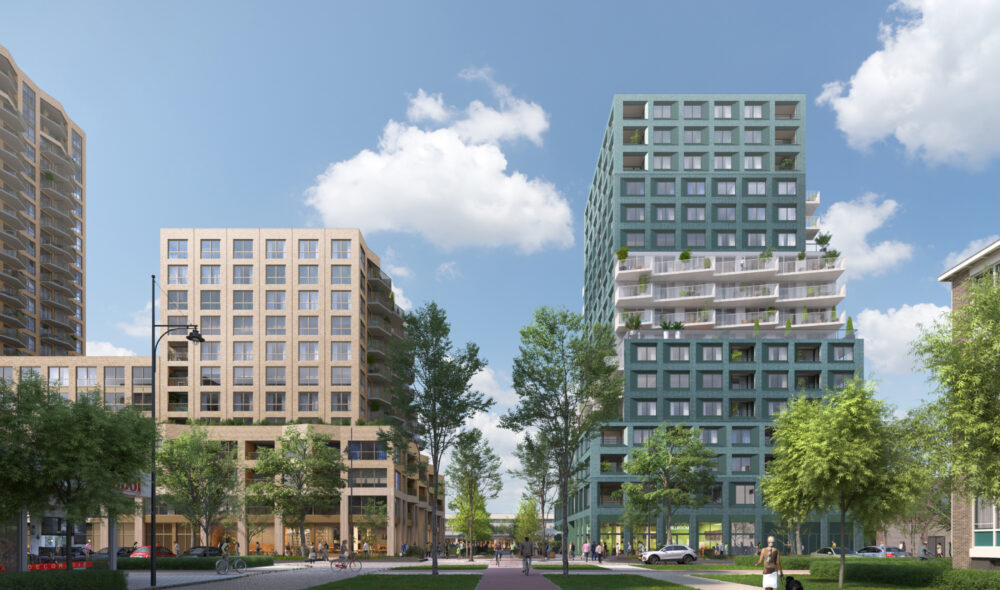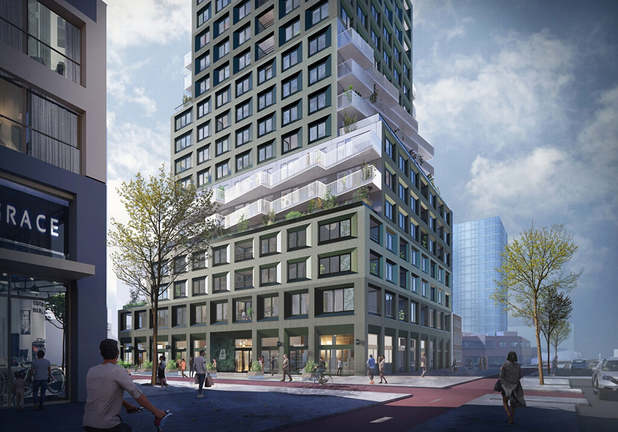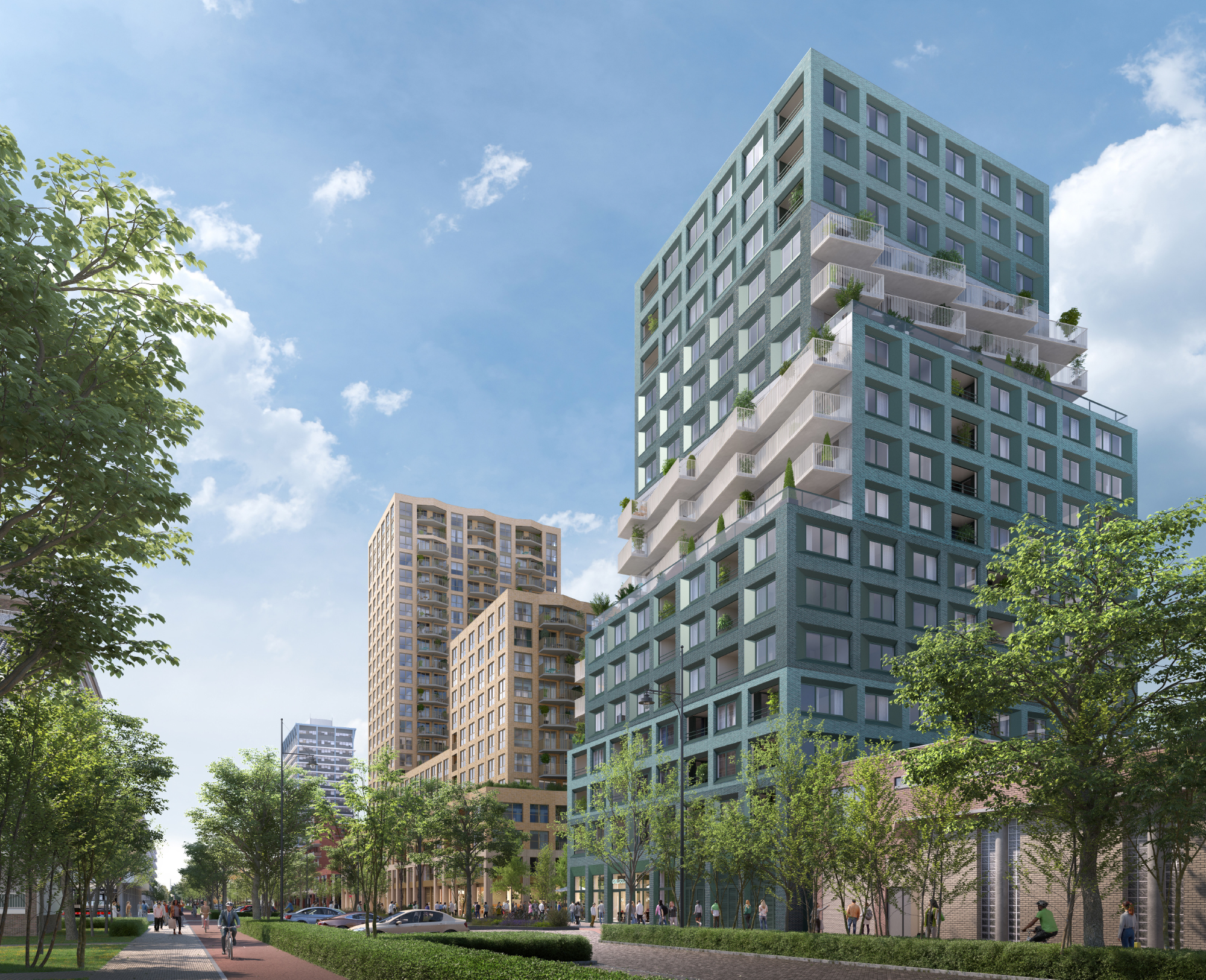 - De badkamer is uitgerust met een wastafel (60 cm) met mengkraan en spiegel, een hardglazen douchedeur en een elektrische handdoekradiator. De wanden van de badkamer worden betegeld met witte glanzende wandtegels in de afmeting 30x45 cm (liggend verwerkt) tot aan het plafond. De vloer wordt voorzien van donkergrijze vloertegels in de afmeting 30x30 cm.