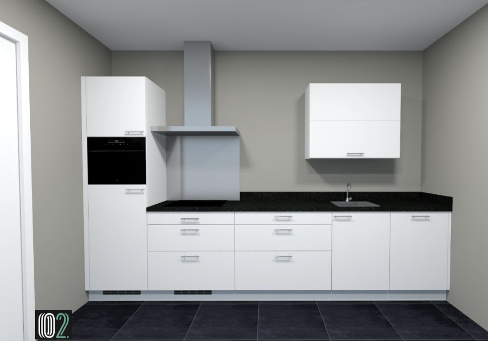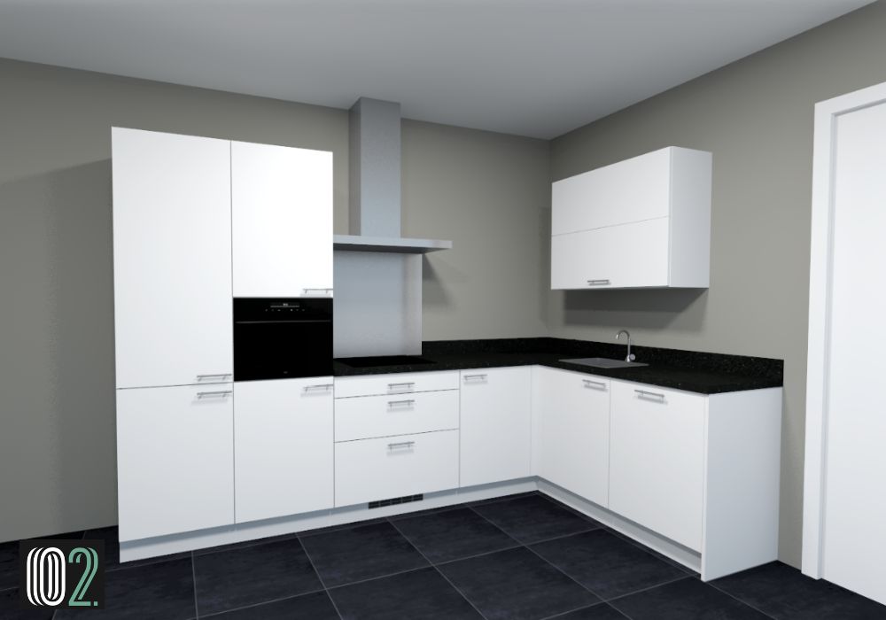 - Complete witte Bruynzeel keuken met zwart composiet werkblad en RVS spatscherm. Uitgerust met inbouwapparatuur: afzuigkap, inductiekookplaat, combimagnetron, koelkast en vaatwasser. Alles netjes ingebouwd voor een strakke, moderne uitstraling.